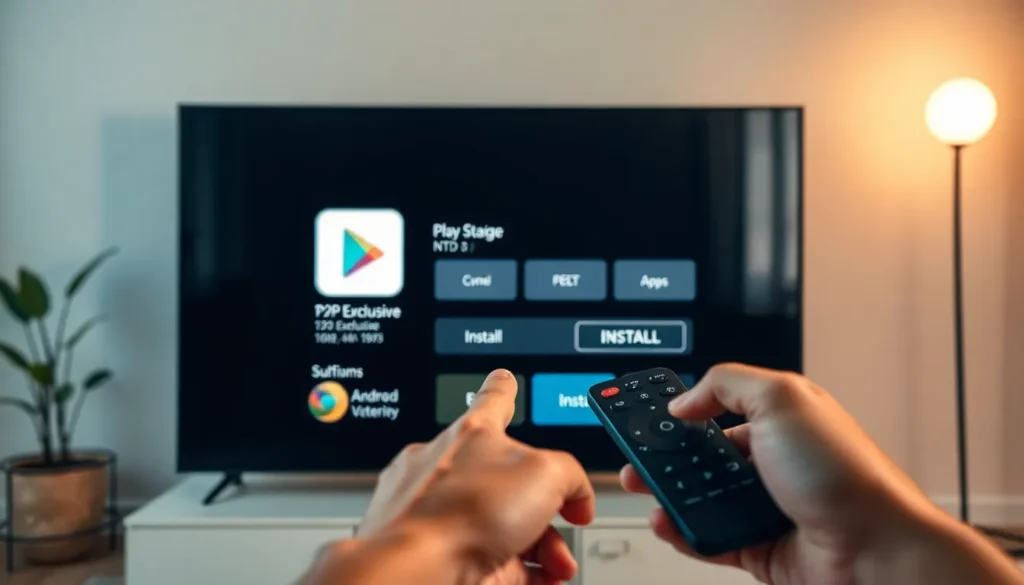 - Controle remoto do Android TV para navegar pela Play Store e confirmar permissões.